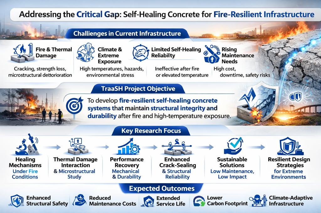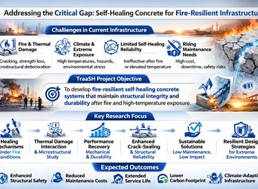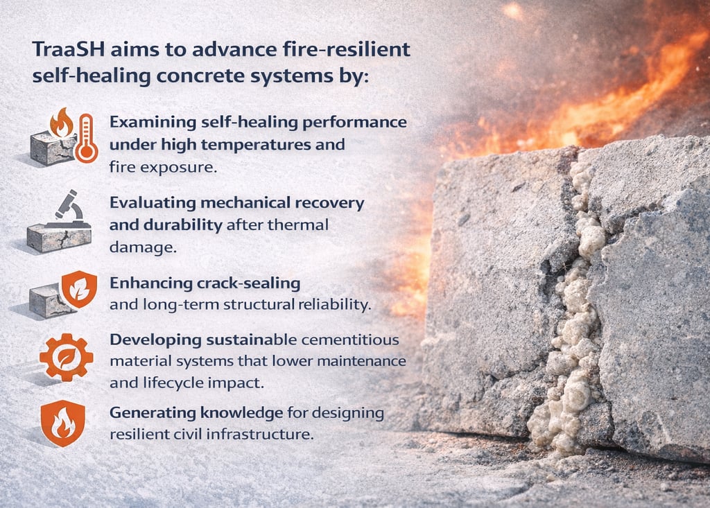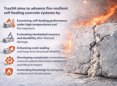 TraaSH contributes to advancing interdisciplinary research at the intersection of materials science, structural engineering, and fire resilience. By integrating self-healing technologies with high-temperature performance evaluation, the project expands the understanding of how smart cementitious materials respond to thermal stress and structural degradation.